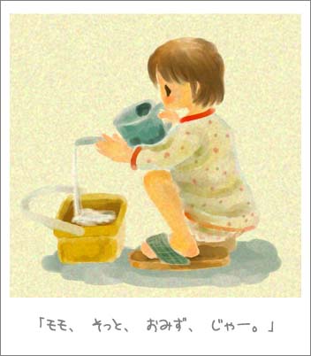 お水を、バケツから小さいじょうろへ、小さいじょうろから大きなじょうろへ。